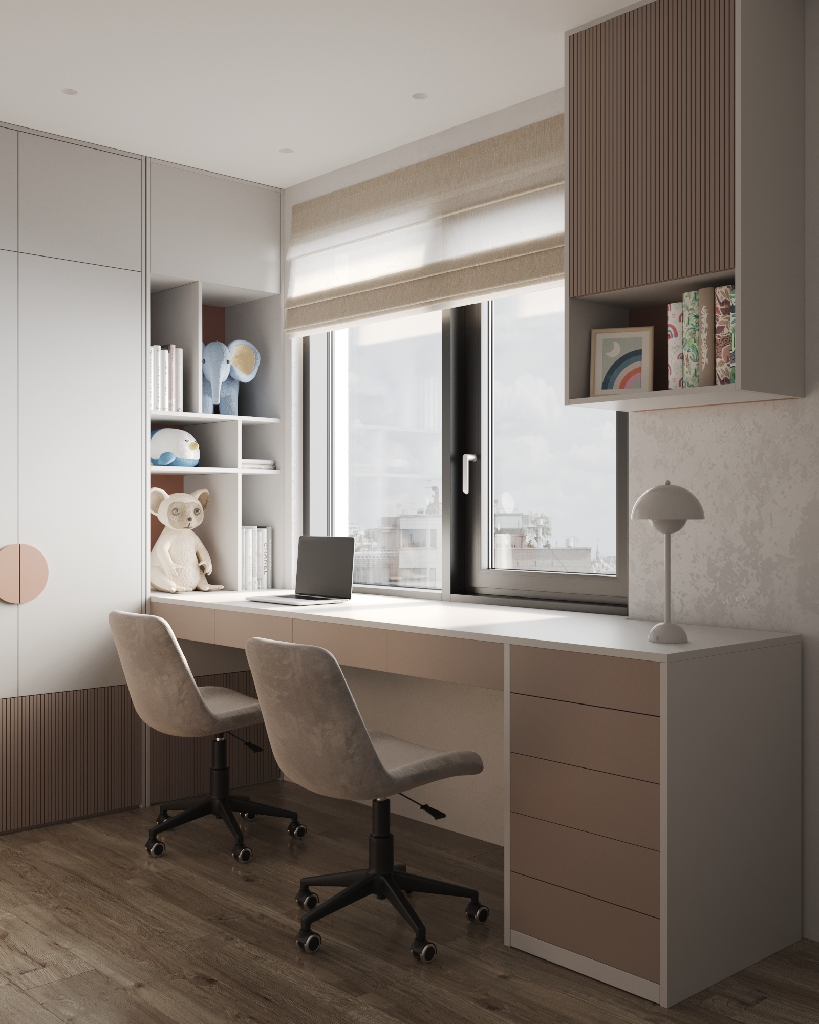 Большая столешница на двоих, встроенные системы хранения и нейтральная цветовая палитра создают идеальное место для учебы и творчества.
