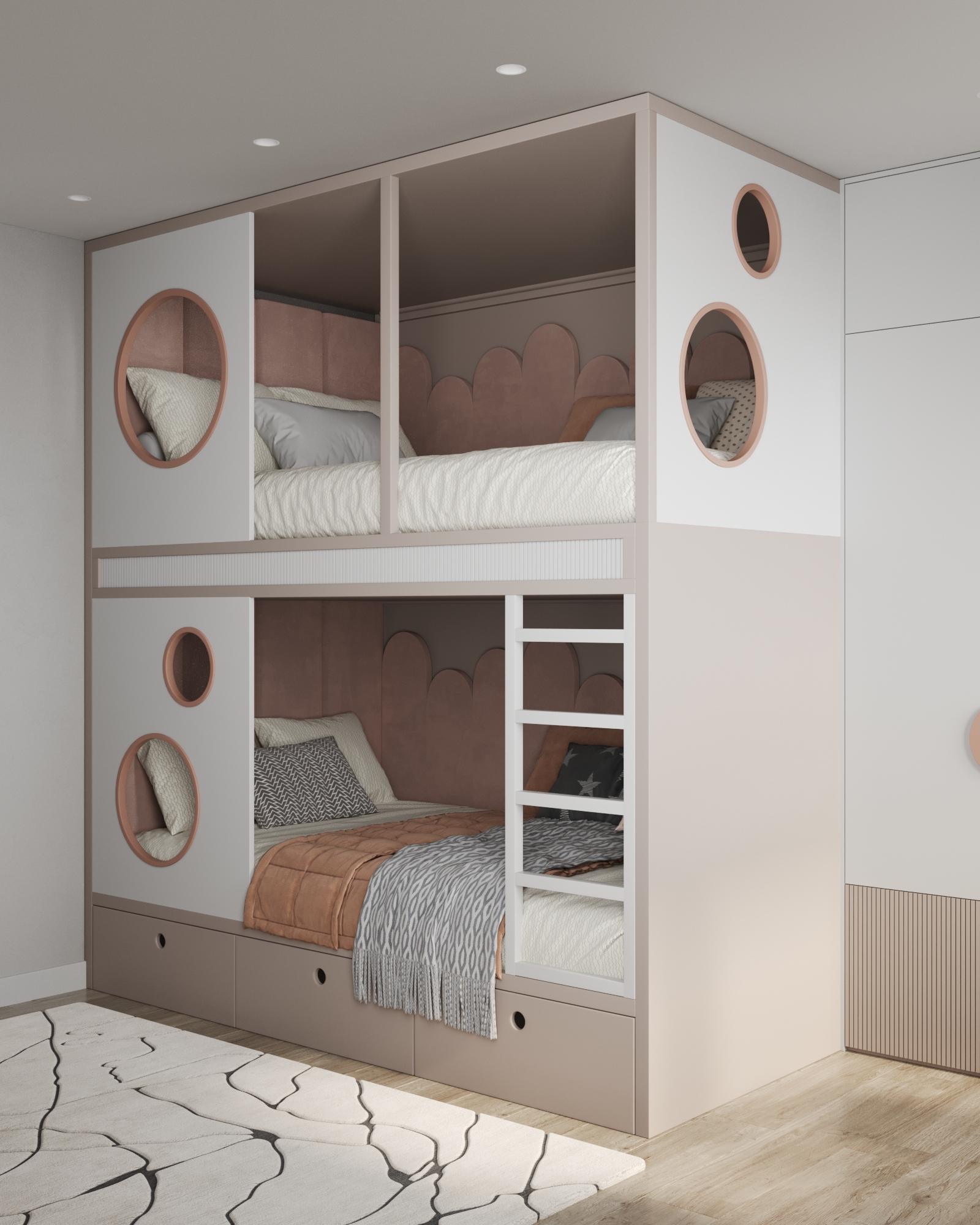 Уютная, безопасная и визуально лёгкая. Мягкие панели, округлые формы, встроенные ящики для хранения и аккуратная лестница — всё продумано для комфорта и самостоятельности детей.