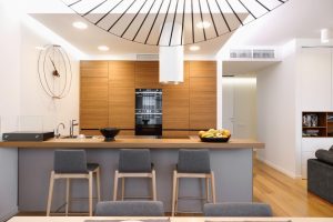 Сбалансированное сочетание дерева и базового цвета идеально вписывается в современный дом. Также для расширения функционала остров дополнен барной стойкой, что увеличивает количество посадочных мест. С таким решением вам точно будет куда расположить гостей!