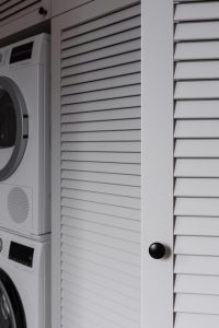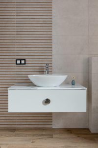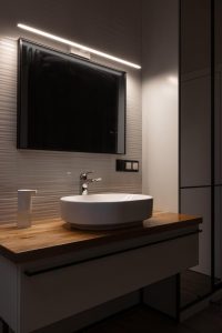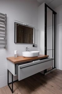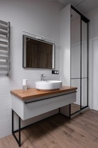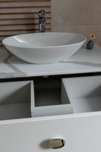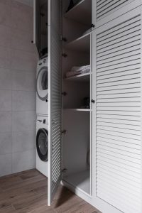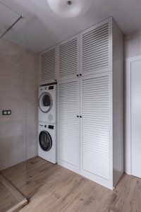 Проект мебели для ванной Нарочь — это вместительный шкаф для хранения вещей с местом для сушильной машины, две специальных тумбы под мойку и высокий шкаф с зеркалом в полный рост.