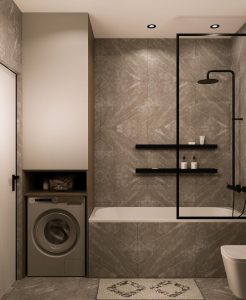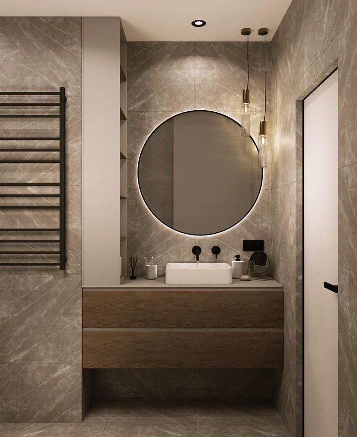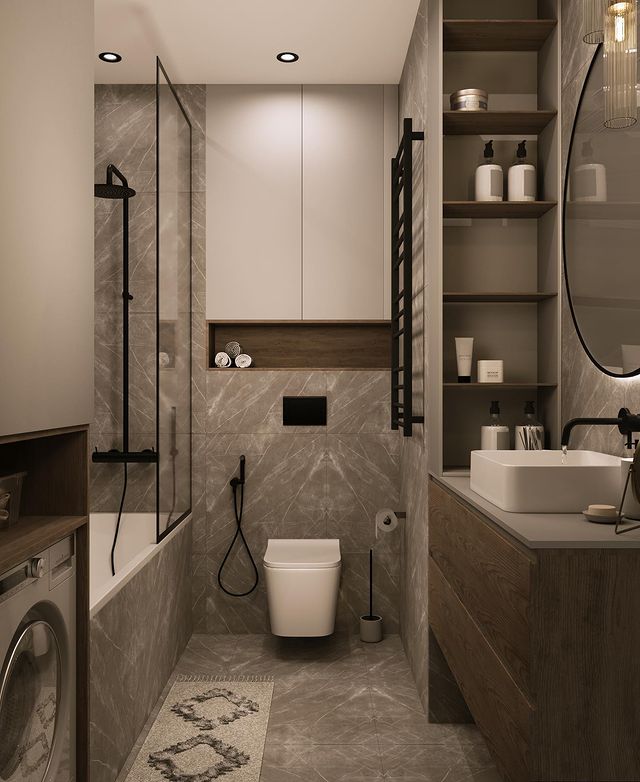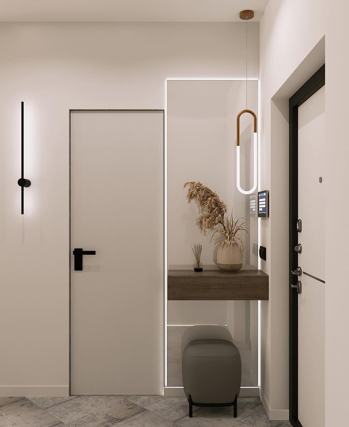 ✔️ Слева от зеркала — стеллаж с открытыми нишами для хранения