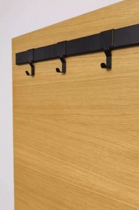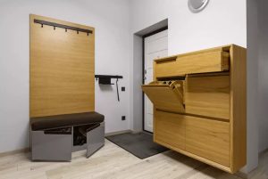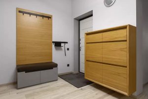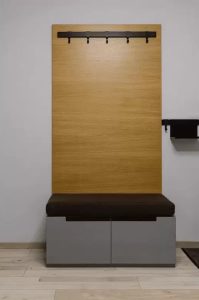 Прихожая состоит из вешалки с местом для сидения и просторным местом для хранения, «парящим» стеллажом для обуви.