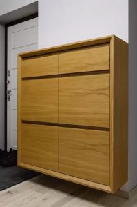 Уникальный стеллаж для обуви висит на стене, что значительно упрощает работу для робота-пылесоса, а запилы под углом 45 градусов делают эстетический вид стеллажа еще более уникальным и легким.
