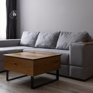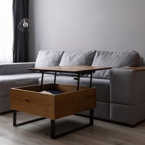 Трансформируется из журнального в полноценный рабочий стол с нишей для хранения.